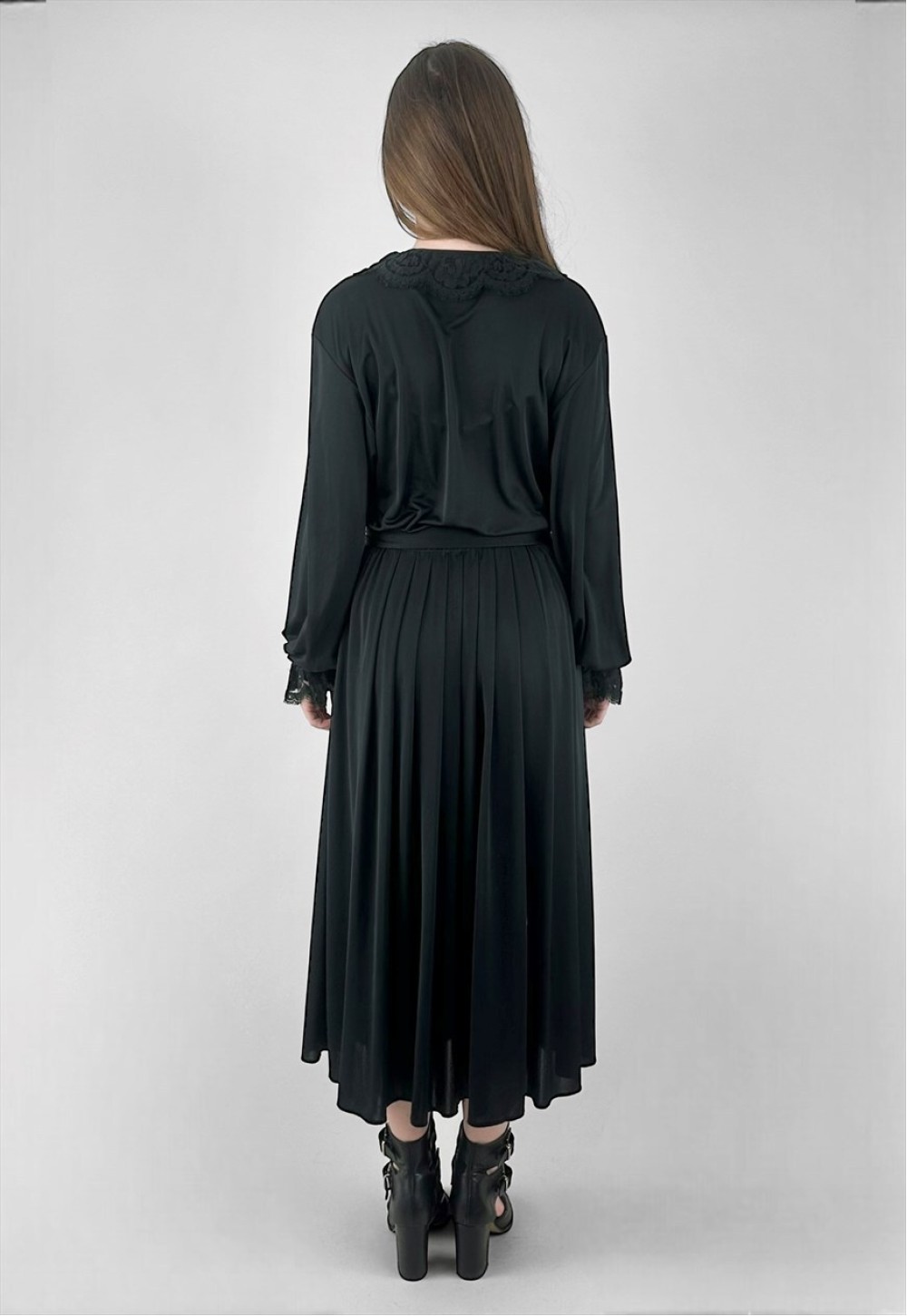 70's Vintage Black Long Sleeve Lace Ladies Midi Dress