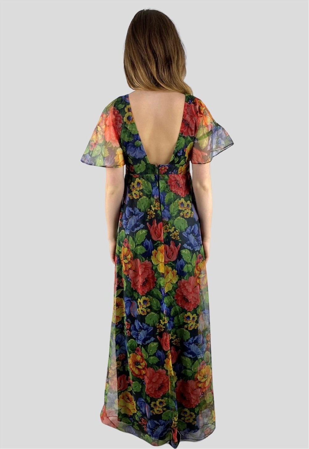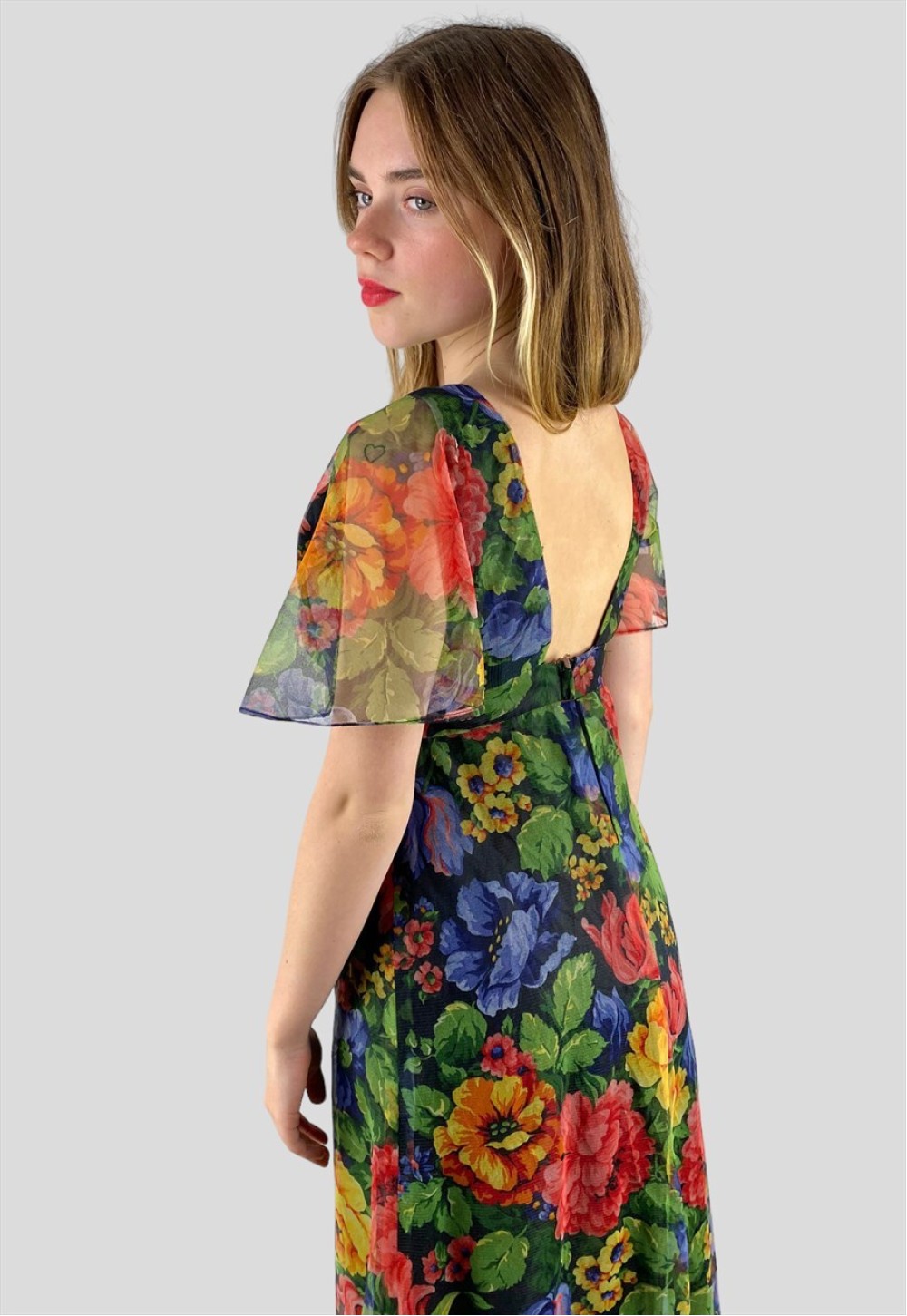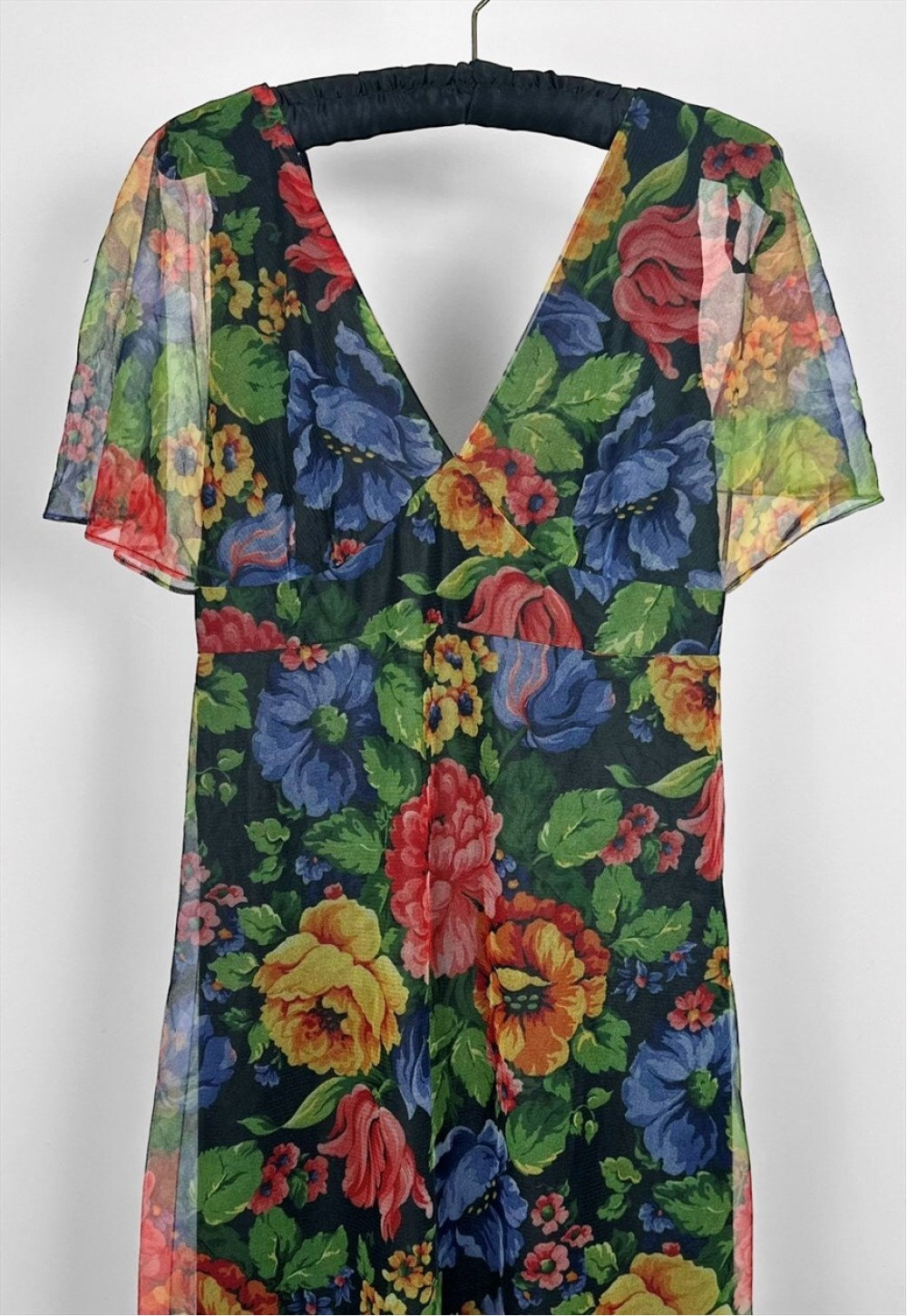 Approximate measurements in inches:Bust:15 laid flat acrossWaist:15 across laid flatLength:60Very pretty ladies sheer floral maxi dress with fluted angel sleeves.Dress has a black Approximate measurements in inches:Bust:15 laid flat acrossWaist:15 across laid flatLength:60Very pretty ladies sheer floral maxi dress with fluted angel sleeves.Dress has a black lining.Size 12 in the label but slightly smaller in todays sizing.Dress zips up at the back of the dress.All of our vintage items are in very good condition but as they are pre-worn there may be some general wear. We endeavour to mention any defects if applicable. You are investing in a timeless sustainable garment. Thank you for shopping The Archive. Follow us on instagram: thearchivelondon xx