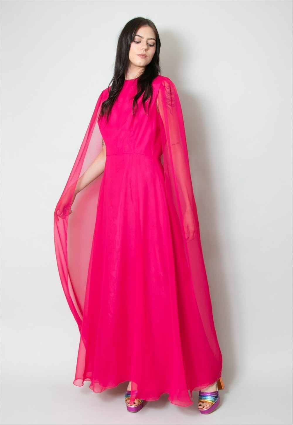 Approximate measurements in inches:Bust:19Waist:14.5Length:58Shoulder to shoulder:15Absolutely stunning 1970's bright pink caped ladies original dress designed by Fredeking of Berlin Approximate measurements in inches:Bust:19Waist:14.5Length:58Shoulder to shoulder:15Absolutely stunning 1970's bright pink caped ladies original dress designed by Fredeking of Berlin of Germany. A light sheer fabric and the dress is fully lined.Dress zips up at the back of the dress and cape is attached at the shoulder. Very good vintage condition but one small hole near on the hem at the front where possibly the dress has caught on a shoe. For more pictures please let me know.If the sizing is mentioned with original sizing and labels please be aware this is vintage sizing so please check our measurements. Measurements are taken with the item laid flat and across.Model is 5ft 9 and a UK size 6-8. Some garments may have been pinned to the model but not all. We would love to see your vintage looks, please tag us in your posts to be featured on our Instagram page - thearchivelondonAll of our vintage items are in very good condition but as they are pre-worn there may be some general wear. We endeavour to mention any defects if applicable. You are investing in a timeless sustainable garment. Thank you for shopping with The Archive.