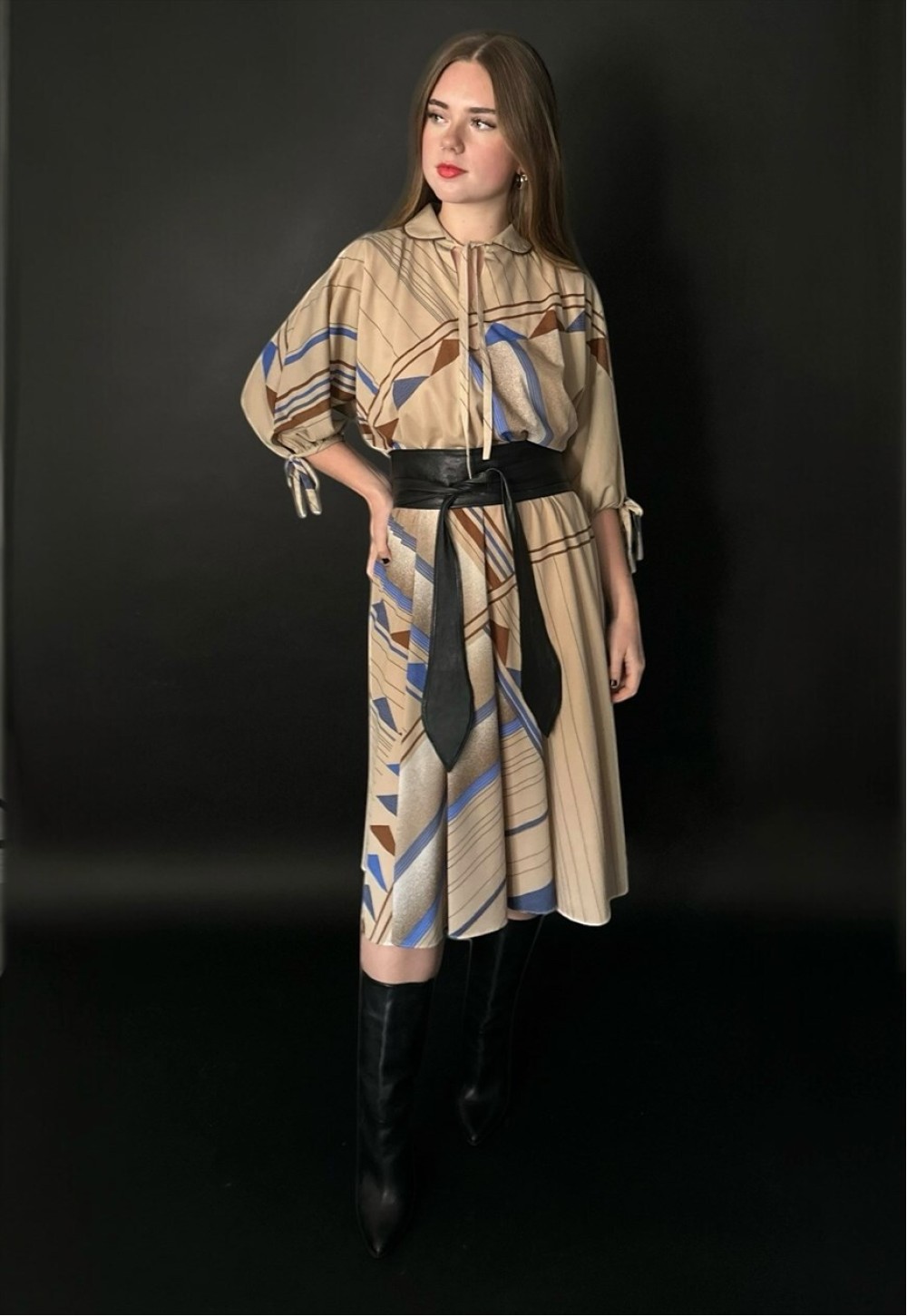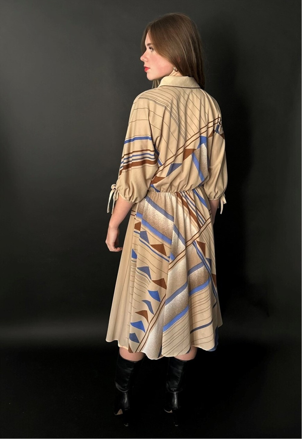 Approximate measurements in inches:Bust:21.5Waist:14Length:43 Vintage light brown 80's batwing midi dress.Dress has a abstract blue and brown print.Polyester fabric.Designed for Approximate measurements in inches:Bust:21.5Waist:14Length:43 Vintage light brown 80's batwing midi dress.Dress has a abstract blue and brown print.Polyester fabric.Designed for by Sixth Sense.Size 21 in the label but would fit a small/medium to large as generous elasticated waist and batwing arms.We have style with a black leather kimono belt (not included).Circular style skirt.Elasticated waist.Dress pulls on over the head.Thin pussy bow ties around the neckline.One small mark on the sleeve as seen in the close up image.Fabric is quite light so there are a few light snags.Skirt has a nylon lining.If the sizing is mentioned with original sizing and labels please be aware this is vintage sizing so please check our measurements. Measurements are taken with the item laid flat and across.We would love to see your vintage looks, please tag us in your posts to be featured on our Instagram page - thearchivelondonAll of our vintage items are in very good condition but as they are pre-worn there may be some general wear. We endeavour to mention any defects if applicable. You are investing in a timeless sustainable garment. Thank you for shopping with The Archive.