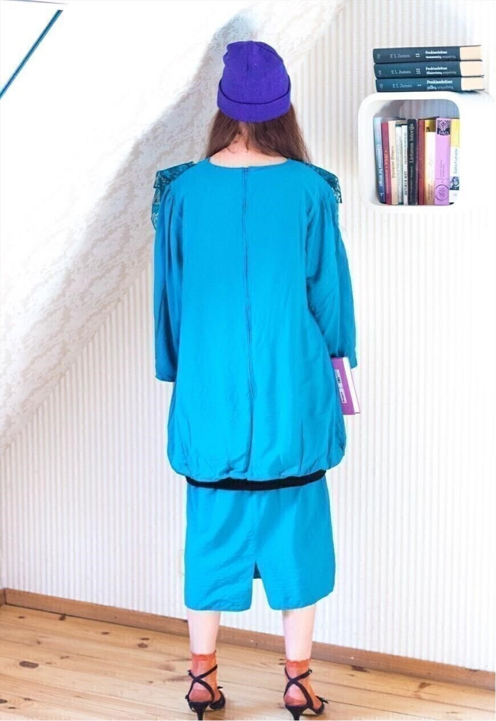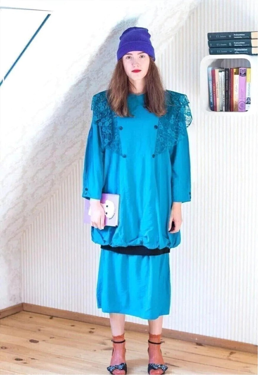 Lovely teal turquoise blue midi long sleeve vintage dress with crochet details at the front. The size on the label is 44. Model is a UK 6 and 5"4. Length of the dress is 45 inches, chest 22 Lovely teal turquoise blue midi long sleeve vintage dress with crochet details at the front. The size on the label is 44. Model is a UK 6 and 5"4. Length of the dress is 45 inches, chest 22 inches, has a zip at the back. Please note this is a vintage item so minor signs of wear are expected.