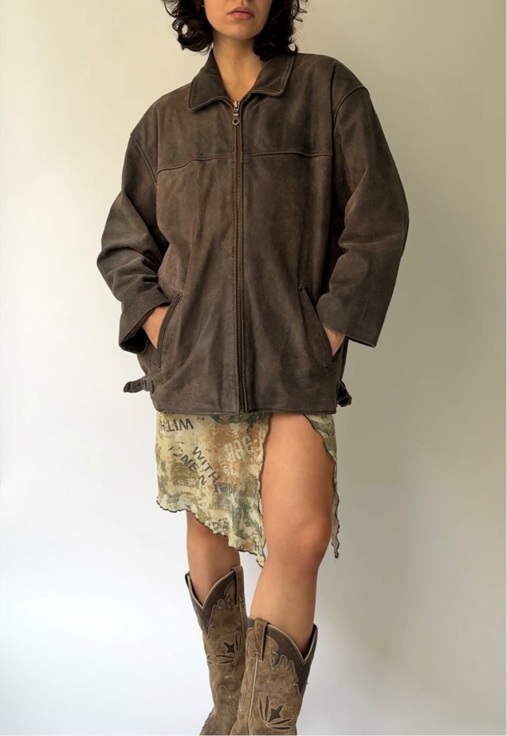 Beautiful brown suede leather jacket with a faded finish. Zipper down the front.Size: Large (men) - fits S-L for women depending on desired fitMeasurements: Pit-pit 63 cm, length 74 Beautiful brown suede leather jacket with a faded finish. Zipper down the front.Size: Large (men) - fits S-L for women depending on desired fitMeasurements: Pit-pit 63 cm, length 74 cmMaterial: LeatherCondition: Good vintage condition