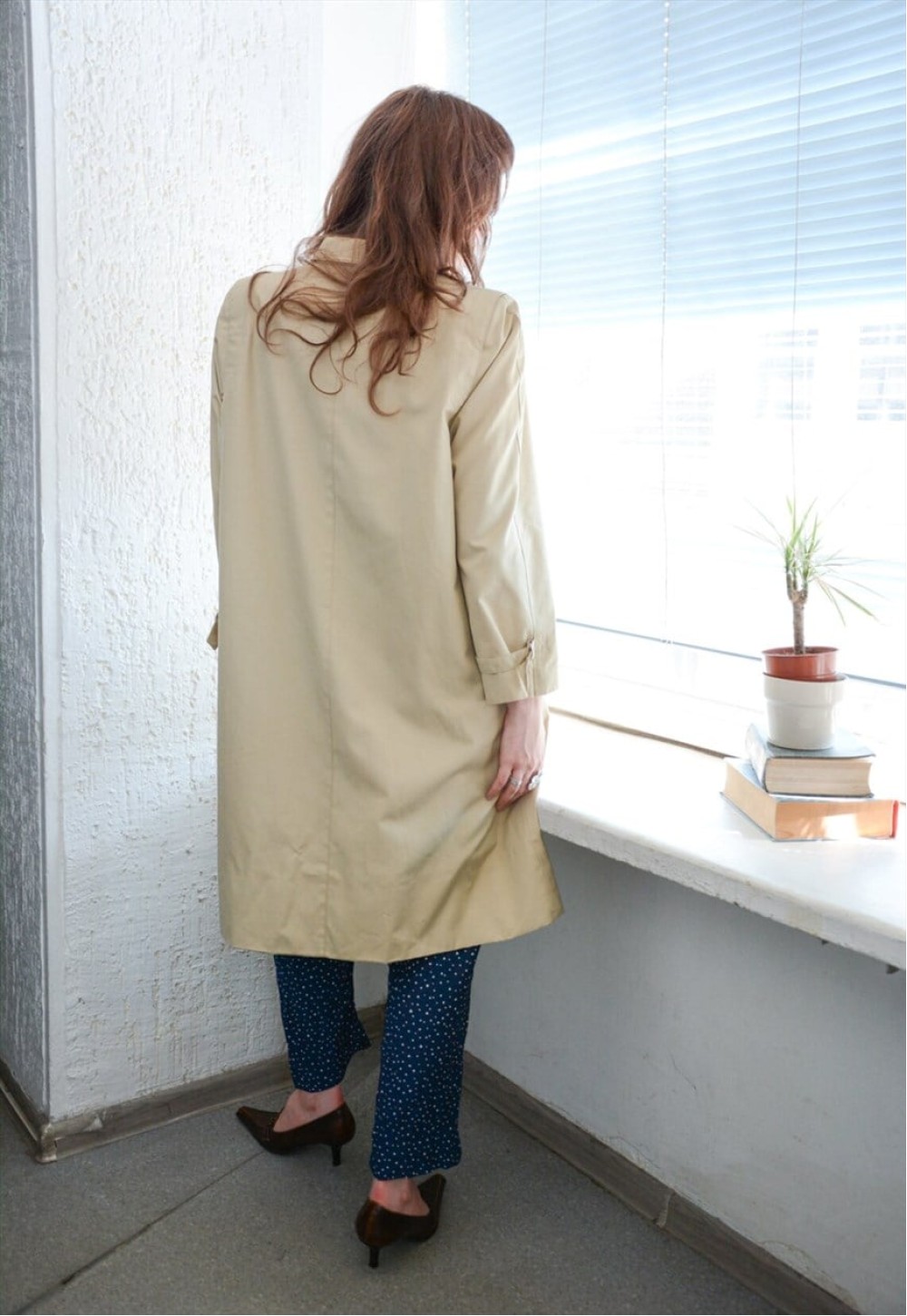 Vintage beige trench coat with side pockets. 65% polyester, 35% cotton. Made in Germany. UK size not written but looks flexible like 8-12. Model size on the photo is 10. Measurements: length Vintage beige trench coat with side pockets. 65% polyester, 35% cotton. Made in Germany. UK size not written but looks flexible like 8-12. Model size on the photo is 10. Measurements: length 40.5 inches, sleeve 21 inches, chest 42.5 inches, waist 41 inches, hips 44.9 inches.