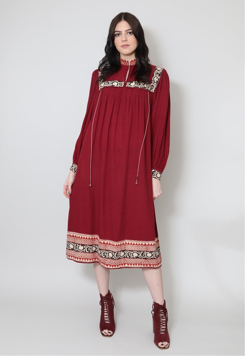 40% New 70's Vintage Maroon Bell Sleeve Smock Midi Dress