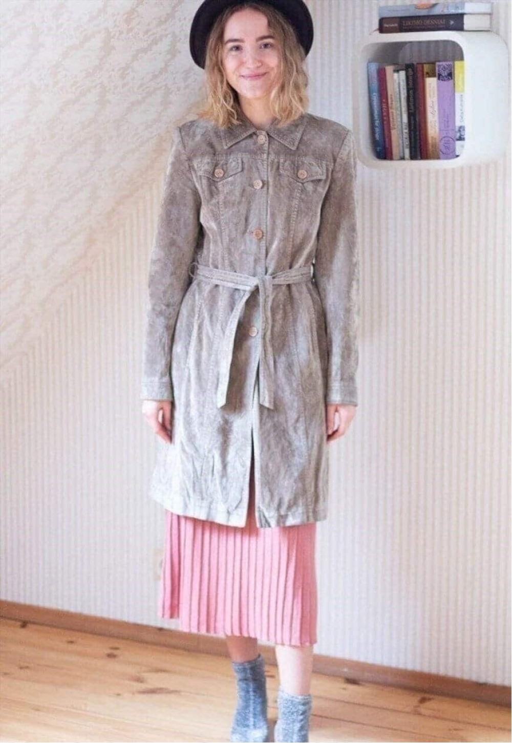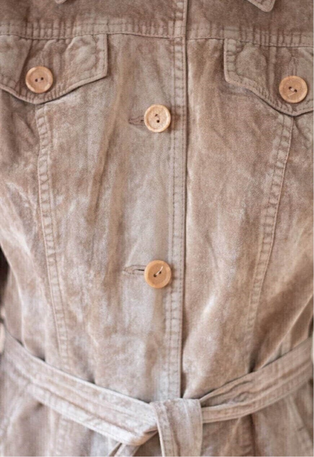 Lovely light brown soft suede velvet velour long belted vintage jacket. The size on the label is 36. Model is a UK 6 and 5"4. Length of the jacket is 36 inches, chest 18 inches, waist is 15 Lovely light brown soft suede velvet velour long belted vintage jacket. The size on the label is 36. Model is a UK 6 and 5"4. Length of the jacket is 36 inches, chest 18 inches, waist is 15 inches. Please note this is a vintage item so minor signs of wear are expected.